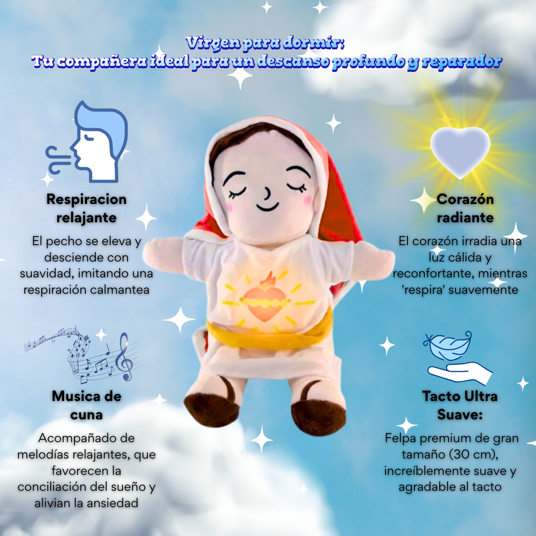Esta Virgen para dormir te brinda tranquilidad con su suave respiración, luz cálida y música relajante. Su tacto ultra suave y serenidad te ayudan a conciliar el sueño y aliviar la ansiedad, ofreciéndote paz en tus momentos de necesidad